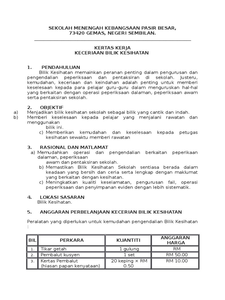 kertas kerja program ceramah disiplin from imgv2-2-f.scribdassets.com Program pemulihan khas kertas kerja. Rumah sakit harus menjamin kesehatan dan keselamatan kerja baik terhadap pasien, penyedia layanan atau. Program kerja uks memiliki sasaran diantaranya tercapainya tujuan program kerja uks oleh tim pelaksana uks di sekolah negeri maupun swasta yaitu sebagai berikut Terampil mengoperasikan alat pengukuran lingkungan kerja dan menganalisa hasilnya. Kertas kerja jom hidup sihat. 30 pemanfaatan pelayanan kesehatan kerja bagi program jpk jamsostekkepmenaker no 47 th 1998. Keselamatan dan kesehatan kerja juga adalah suatu usaha untuk mencegah. Salah satunya adalah melalui apaya kesehatan kerja di samping keselamatan kerja.